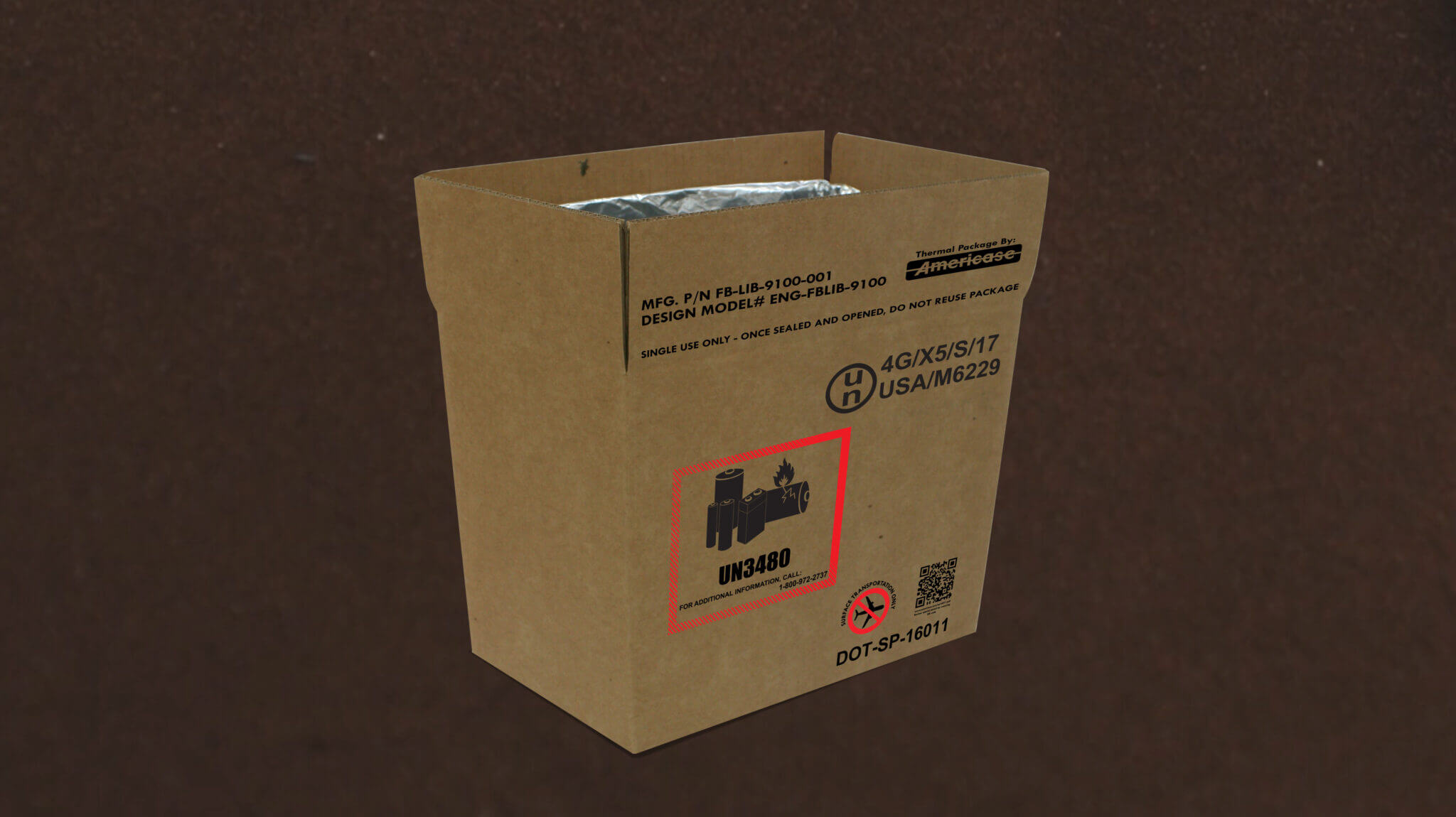 The Battery Box is a thermally lined, fiberboard kit based on the “box within a box” configuration. Built for the safe transportation of DDR batteries, this shipping solution is made to handle higher watt-hour shipments and the more unstable battery products in the most common recall and recovery events. The Battery Box is rated to ship an aggregate of up to 1,500 watt hours, making it a great option for shipping multiple batteries or cells inside or outside of equipment